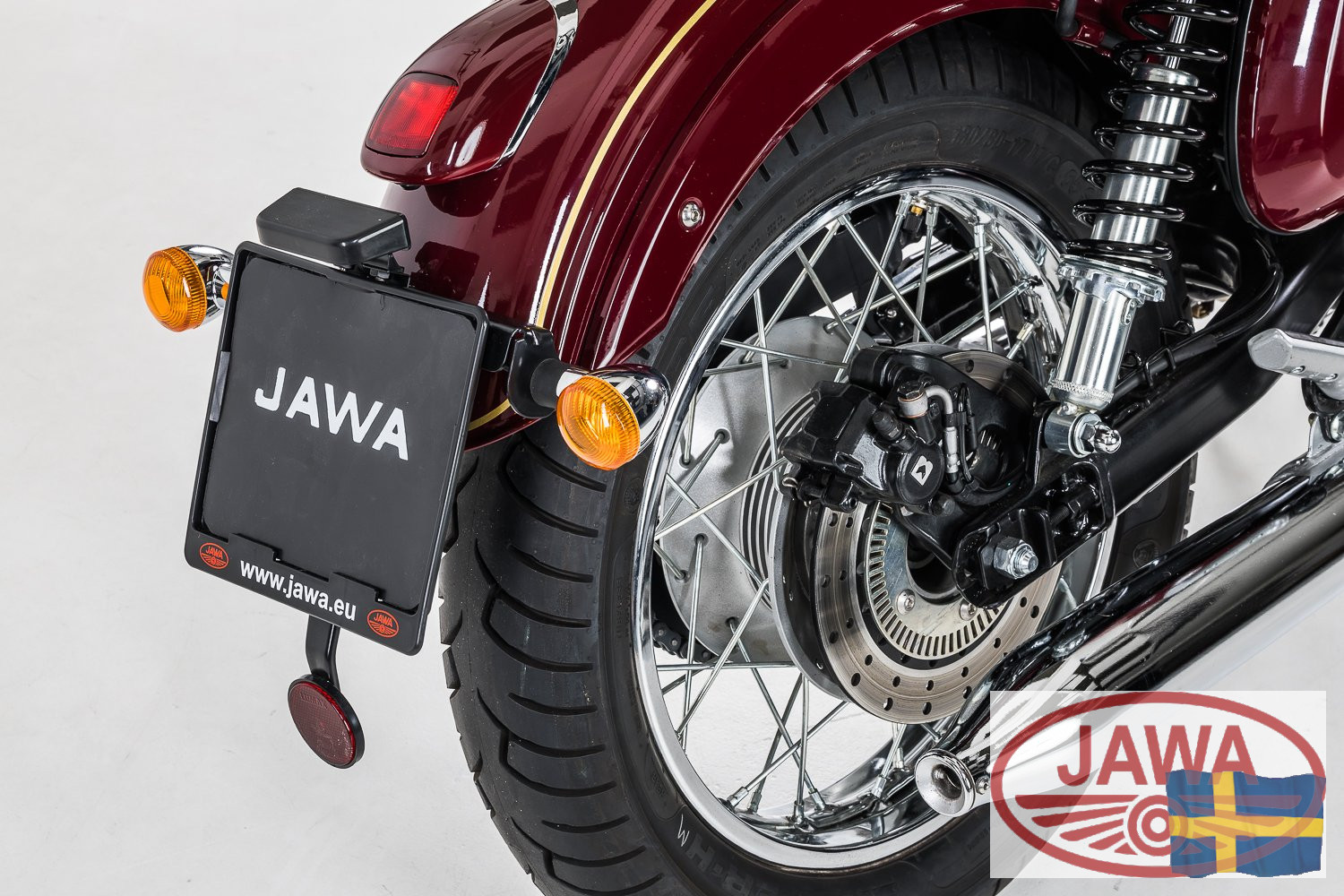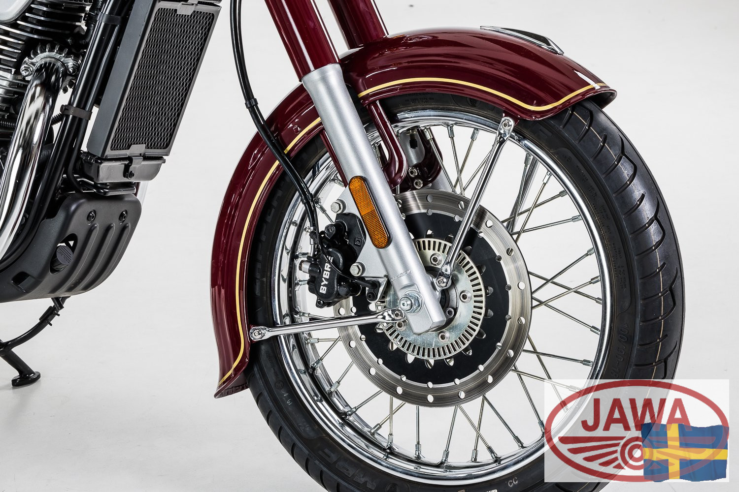 Säkra inbromsningar: Till skillnad från gårdagens trumbromsar är JAWA 350 CL utrustad med moderna och effektiva skivbromsar. Tillsammans med ett tvåkanals ABS-system garanteras du korta och säkra bromssträckor oavsett väderförhållanden.