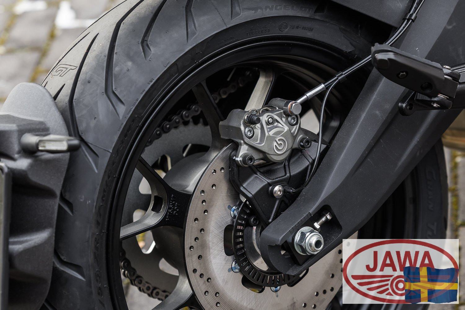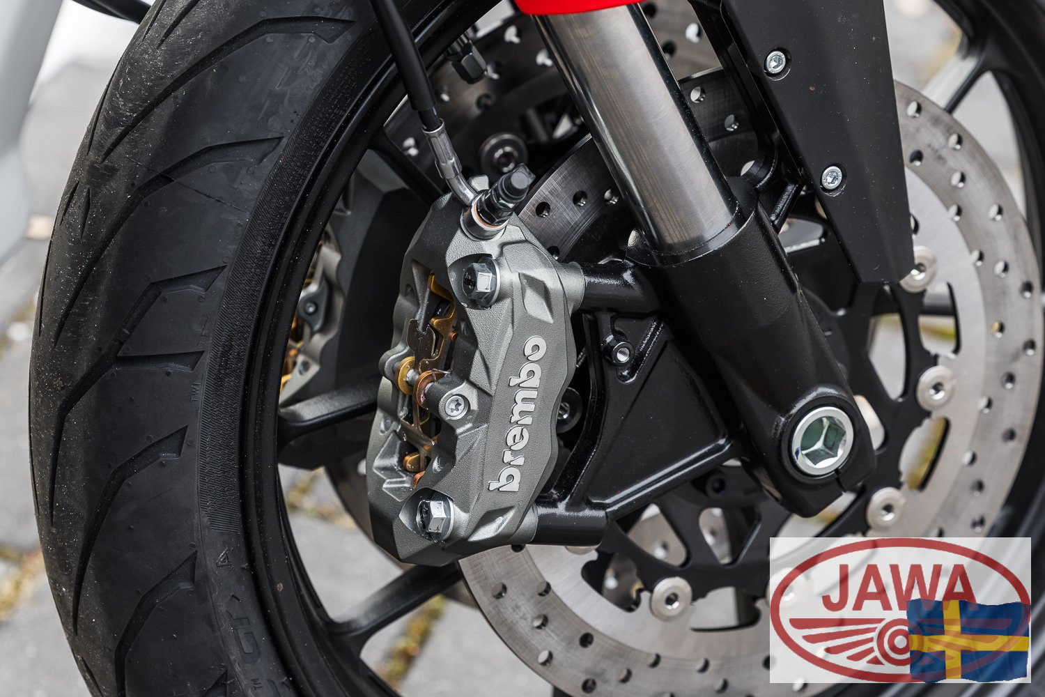 Extrem bromskraft: Framhjulet hålls i schack av dubbla, stora skivbromsar med högpresterande bromsok från italienska Brembo, stöttade av ett modernt ABS-system.