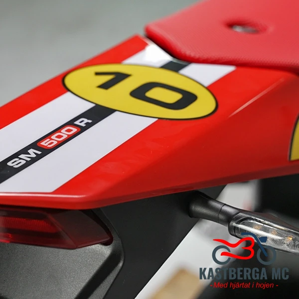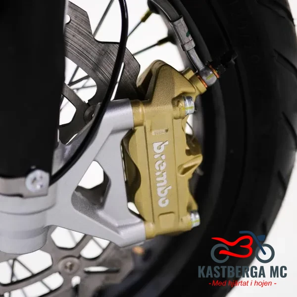 Bromsar från Brembo: För att matcha fartresurserna är SM 500R utrustad med ett bromssystem i toppklass från Brembo. Den massiva, flytande Ø 300 mm-skivan fram ger ett brutalt bett och exakt fingertoppskänsla vid sena inbromsningar.